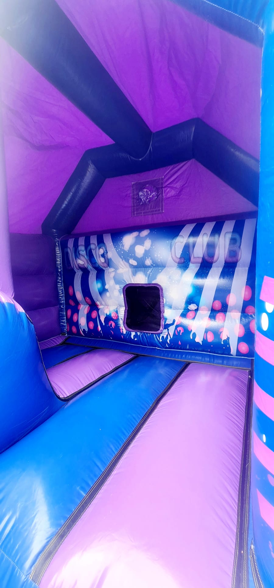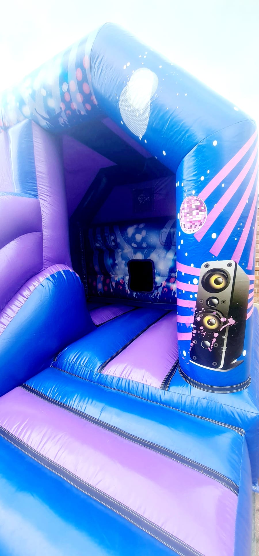 🎉 Get ready for a bouncing good time with our bright and fun Disco Combo castle! Perfect for children's parties and events, this inflatable bouncy castle features a slide for added excitement and entertainment. Vibrant bright purple and blue our Disco Jumping Slider is a firm favourite year on year. Fitted with additional disco lights and a discreetly fitted blue tooth disco speaker for tunes and jumping joy.