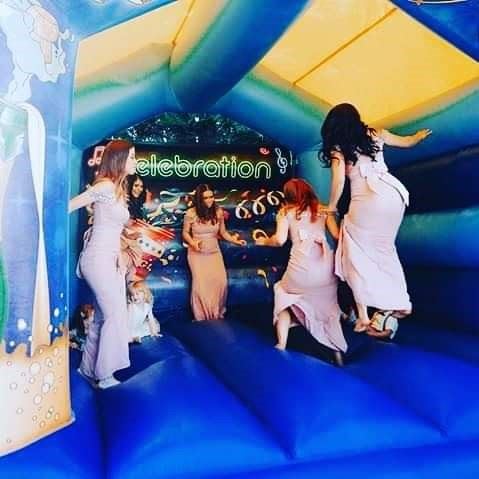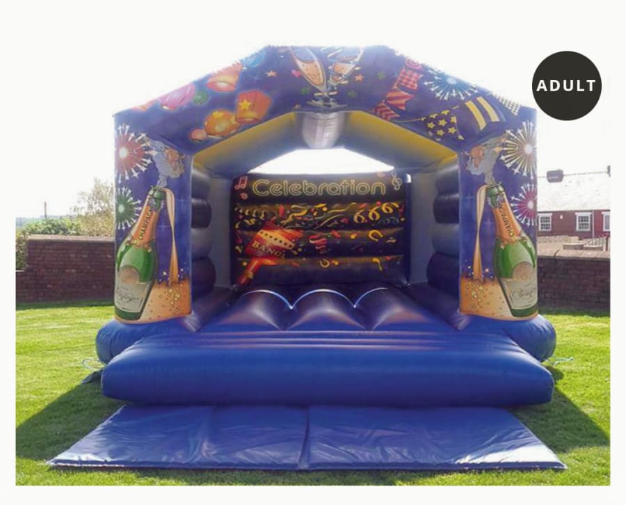 Chris's Castles Bouncy Castle Hire Wakefield 16x20ft Adult/Family Celebration Bouncy Castle. Decorated with Champagne flutes and fizzing Champagne Bottles with spectacular celebratory fireworks no wonder the Adult Celebration Bouncy Castle is a instant hit at Weddings, Anniversaries and Family Celebrations. The Celebration Castle is sure to enhance any party and give it that WOW factor!