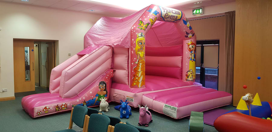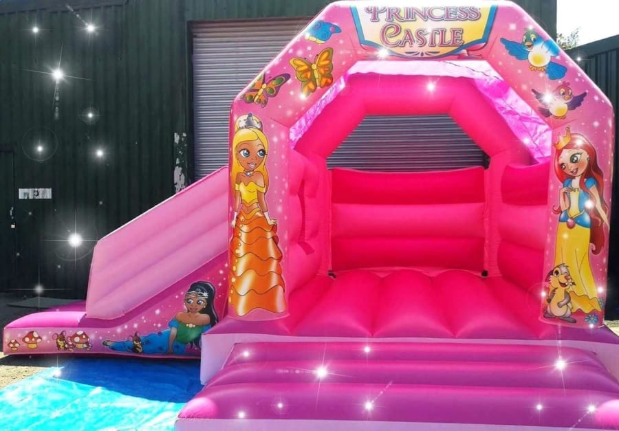 Chris's Castles Bouncy Castle Hire Pretty Princess Combo Castle. A nice upgrade to the popular standard pretty princess tots castle with a slide on the side. A popular alternative to a straight forward girls bouncy castle. Bright pink with pretty princesses,birds and butterflies to make the little girl in your life's day that extra bit special.