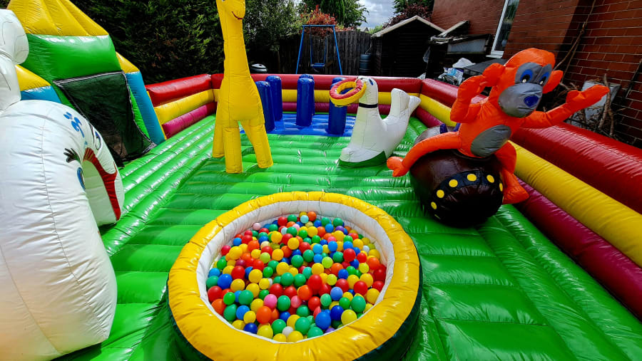 It features a number of farmyard ride on animals, biff and bash and a ball-pool. The rides are made from soft heavy duty gloss plastic. A safety net is at the entrance/exit. Accessible 360 degree supervision/viewing. Lovely soft inflatable base where toddlers and small babies can get their first bouncy castle experience without the risk of falling out of a standard bouncy castle.