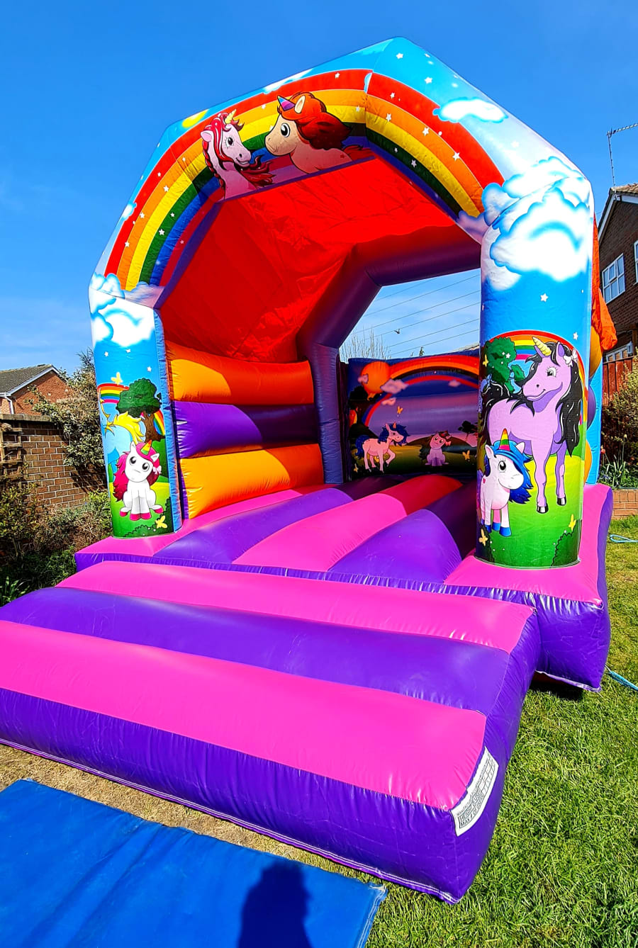 *All sizes are approximate. The 12x15ft Unicorn Bouncy Castle will require an extra 3 feet at the back for a blower and at the front for a mat and 2 feet down each side. A minimum access width of 2 feet will be required. Narrow access, steps, debris, garden furniture, vehicles, blocked drives, common land etc are some of the reasons why we may refuse to deliver the inflatable. If you have any concerns please contact us before booking.