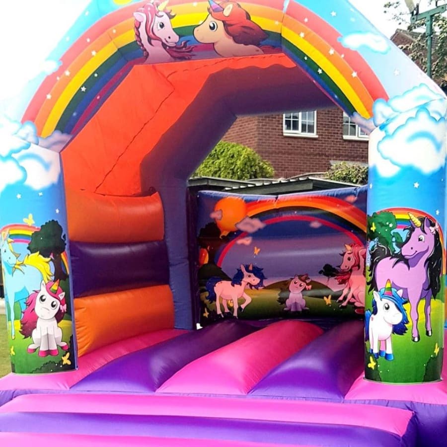 Chris's Castles Bouncy Castle Hire Wakefield District offer the very popular themed Unicorn children's bouncy castle for hire. Increasingly popular, the 11x15x10ft colourful unicorn bouncy castle has a hit with the children. Visually stunning with digital graphics and sharp deep, eye catching colours makes the Unicorn bouncy castle stand out. Very popular with boys and girls.