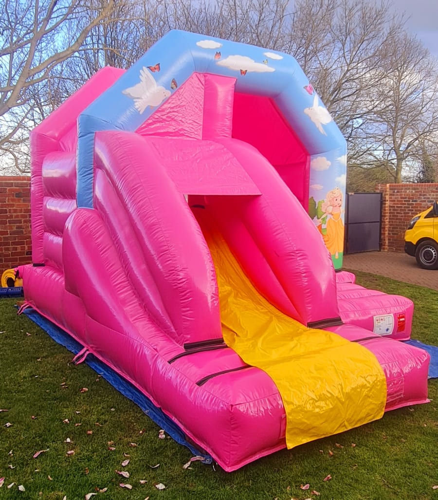 *All sizes are approximate. The 11x16ft Princess Sliding Bouncy Castle will require an extra 3 feet at the back for a blower and at the front for a mat and 2 feet down each side. A minimum access width of 2 feet will be required. Narrow access, steps, debris, garden furniture, vehicles, blocked drives, common land etc are some of the reasons why we may refuse to deliver the inflatable. If you have any concerns please contact us before booking.